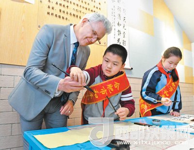 日前,加拿大溫哥華公立教育局考察團(tuán)走進(jìn)安徽省合肥市和平小學(xué)參加中外文化交流活動,親身體驗(yàn)書法、民樂和戲曲等傳統(tǒng)文化課程,零距離感受中國文化的魅力。圖為加拿大客人和和平小學(xué)的學(xué)生們一起學(xué)習(xí)書法。