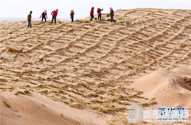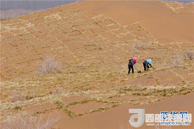 3月27日,在臨澤縣北部干旱荒漠區(qū),人們用麥草筑牢阻沙網(wǎng)。甘肅省臨澤縣位于巴丹吉林沙漠邊緣,沙漠戈壁面積占全縣總面積三分之二以上。連年來,臨澤縣持續(xù)防沙治沙,筑牢生態(tài)安全屏障,目前已建成防風固沙林27.1萬畝,阻沙林帶187公里,封育荒漠植被50萬畝。新華社發(fā)(王將攝)