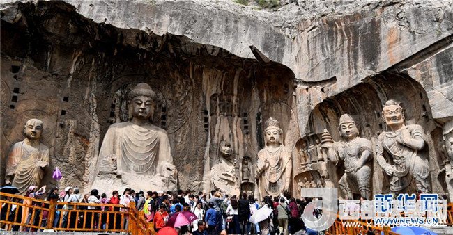 4月11日,游客在河南洛陽(yáng)龍門石窟景區(qū)參觀游覽。
