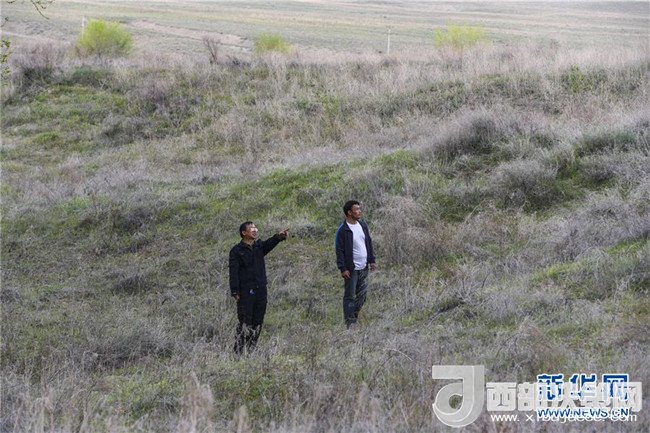 新疆霍城四爪陸龜國家級自然保護區(qū)管理局工作人員林世忠(左)和護林員伊力扎提·伊麻木在保護區(qū)內(nèi)巡查(4月15日攝)。