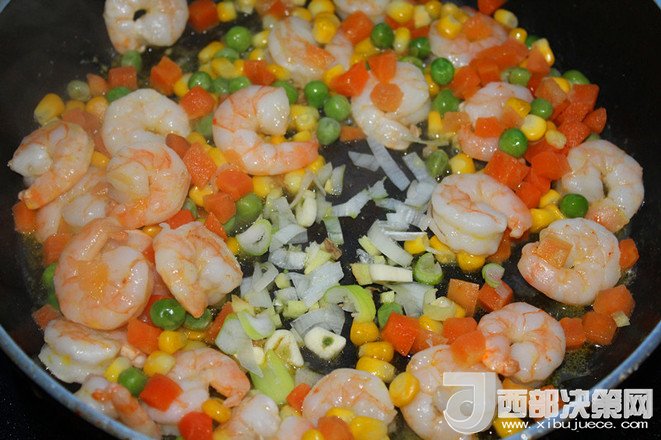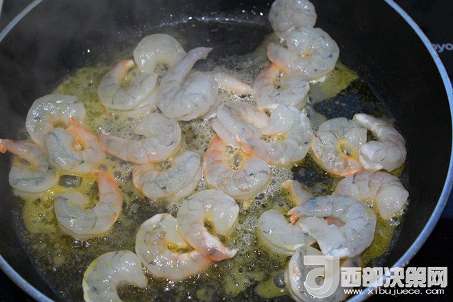 4.鍋里加底油,加蝦仁翻炒。