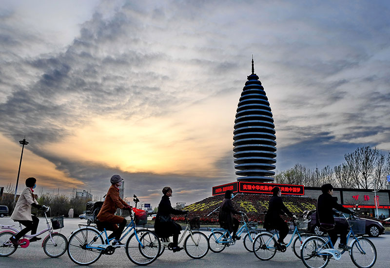 市民在河北雄安新區(qū)容城縣縣城道路上騎行(3月29日攝)。 新華社記者 牟宇 攝