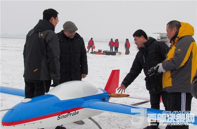 黃大年(左二)及團(tuán)隊成員在極寒天氣下進(jìn)行固定翼無人機(jī)試飛(2013年1月20日攝)。