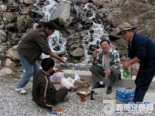 鐘揚(yáng)(右二)與西藏大學(xué)師生在西藏采集種子時在戶外吃午飯(2007年8月21日攝)。