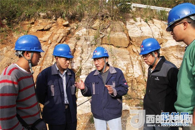 南仁東(左三)與工程技術(shù)人員在大窩凼施工現(xiàn)場檢查施工進(jìn)展(2014年12月1日攝)。