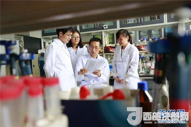 施一公(右二)與團(tuán)隊成員討論文章細(xì)節(jié)(資料照片)。