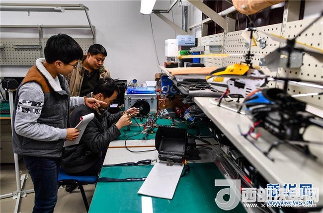 黃大年團(tuán)隊成員在實(shí)驗室內(nèi)調(diào)試、組裝無人機(jī)(2017年2月9日攝)。