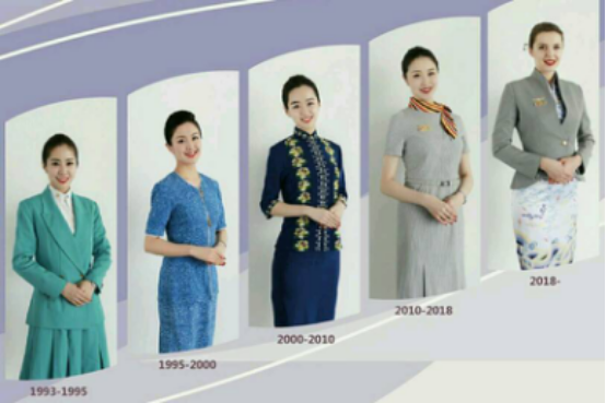 歲月變遷,以優(yōu)質(zhì)服務(wù)贏得客戶青睞的初心不改。圖為海航空乘人員的五代服裝,反應(yīng)了時代的變化。