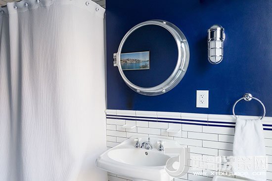 衛(wèi)浴間選擇深藍色與白色搭配,墻面中間位置用藍色條紋腰線來裝飾,頗有海軍風的味道,干凈清爽。