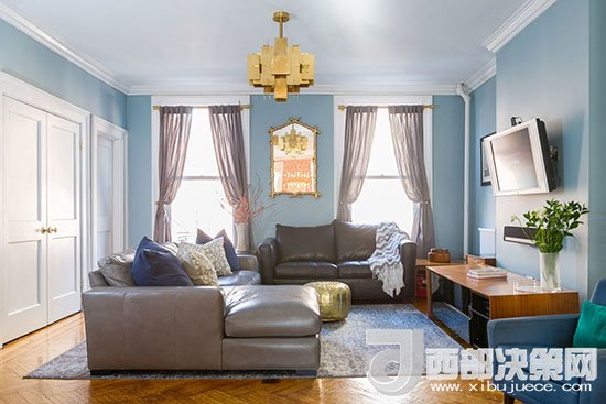 客廳的墻面全部涂刷成藍色,營造出一個雅致柔和的空間氛圍,客廳沙發(fā)選用真皮材質(zhì)的款式,顯得更有復古味道。