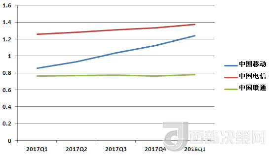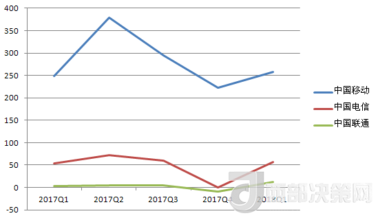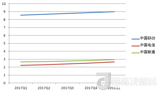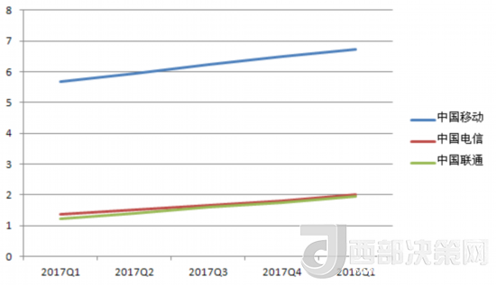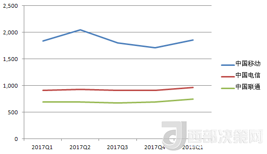 中國電信的營收除了在2017年Q3有所下降,基本處于穩(wěn)步增長趨勢(shì)。其2018年Q1的營收數(shù)據(jù)也在三大運(yùn)營商中排中間。