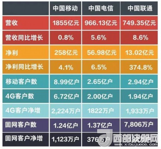 三大運(yùn)營商在各方面皆呈增長態(tài)勢(shì)。移動(dòng)的營收、凈利雖高,但其營收同比增長率僅為0.8%。聯(lián)通的凈利潤同比增長率高達(dá)374.8%,營收同比增幅也是最高,混改成效顯著。
