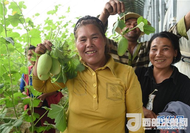 新疆和田市金葉村貧困戶吐尼亞孜·阿布都卡地爾(前左)在北京援建的大棚里展示剛從瓜藤上疏減下來的多余甜瓜(4月18日攝)。