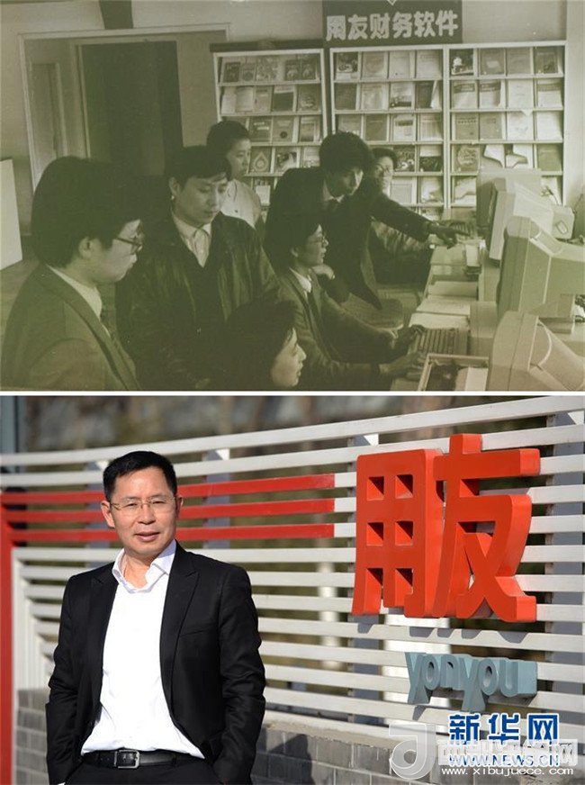 拼版照片:上圖為1989年的用友;下圖為用友網(wǎng)絡(luò)董事長兼CEO王文京(資料照片)。用友是中關(guān)村第一個(gè)拿到私營高新技術(shù)企業(yè)牌照的企業(yè),編號“SY0001”。從創(chuàng)業(yè)時(shí)2個(gè)人的軟件服務(wù)社,到30年后的1.5萬人,用友正從管理軟件公司向?yàn)槠髽I(yè)“賦能”的知名云服務(wù)企業(yè)邁進(jìn)。新華社發(fā)