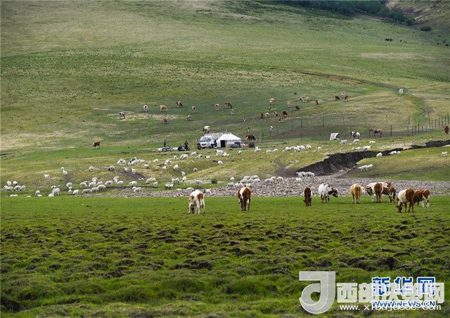 6月6日,牲畜在內(nèi)蒙古赤峰市阿魯科爾沁草原上覓食。 新華社記者 彭源 攝