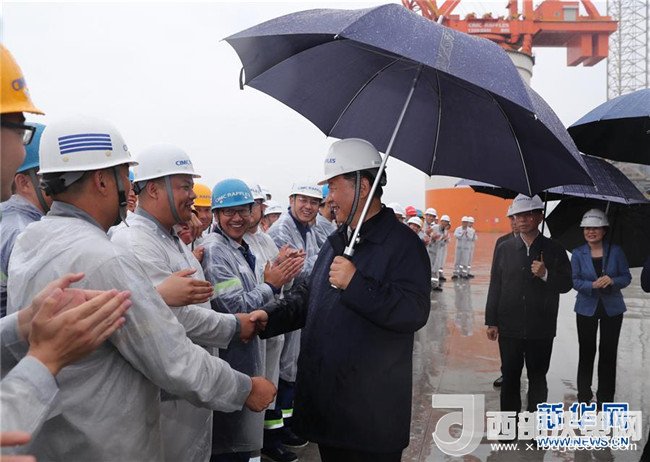 風(fēng)急云低,雨流如注。13日下午,習(xí)近平來到中集來福士海洋工程有限公司煙臺基地。作為國內(nèi)率先進入海洋工程行業(yè)的企業(yè),中集來福士用10年左右時間,國產(chǎn)化率從不足10%提高到60%。在廠區(qū)碼頭上,習(xí)近平撐著雨傘,趟著積水,近距離察看??吭谶@里的自升式修井生活平臺,遠眺“藍鯨1號”超深水雙鉆塔半潛式鉆井平臺、“泰山”龍門吊、海洋牧場平臺,向企業(yè)負責(zé)人詳細了解高端海洋工程設(shè)備制造、維護、運行情況。海風(fēng)吹起了衣襟,雨水打濕了褲腿。習(xí)近平站在雨中,同圍攏過來的工人們一一握手、親切交談,向作業(yè)平臺上的工人們揮手致意。習(xí)近平指出,國有企業(yè)特別是中央所屬國有企業(yè),一定要加強自主創(chuàng)新能力,研發(fā)和掌握更多的國之重器。國有企業(yè)要深化改革創(chuàng)新,努力建成現(xiàn)代企業(yè)。要堅持黨對國有企業(yè)的領(lǐng)導(dǎo)不動搖,堅持建強國有企業(yè)基層黨組織不放松,為做強做優(yōu)做大國有企業(yè)提供堅強組織保證。