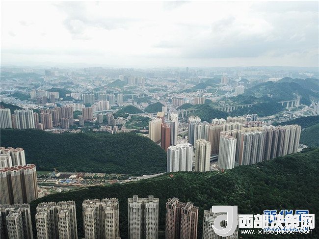 青山圍繞的貴陽(yáng)市城區(qū)一隅(7月3日無(wú)人機(jī)拍攝)。