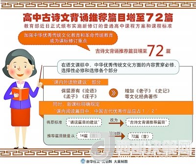 其中,語(yǔ)文課標(biāo)最突出,中華優(yōu)秀傳統(tǒng)文化方面的內(nèi)容貫穿必修、選擇性必修和選修各個(gè)部分。一是內(nèi)容更全,在“課內(nèi)外讀物建議”部分,除保留原有《論語(yǔ)》《孟子》《莊子》外,增加了《老子》《史記》等文化經(jīng)典著作,要求學(xué)生廣泛閱讀各類古詩(shī)文,覆蓋先秦到清末各個(gè)時(shí)期。二是分量更多,課程標(biāo)準(zhǔn)明確規(guī)定“課內(nèi)閱讀篇目中,中國(guó)古代優(yōu)秀作品應(yīng)占1/2”。三是要求更高,在全面加強(qiáng)的同時(shí),還設(shè)置中華優(yōu)秀傳統(tǒng)文化學(xué)習(xí)專題,進(jìn)行中華傳統(tǒng)文化經(jīng)典作品深入學(xué)習(xí)研討。將原標(biāo)準(zhǔn)“誦讀篇目的建議”改為“古詩(shī)文背誦推薦篇目”,推薦篇目數(shù)量也從14篇(首)增加到72篇(首),提高了學(xué)習(xí)要求。