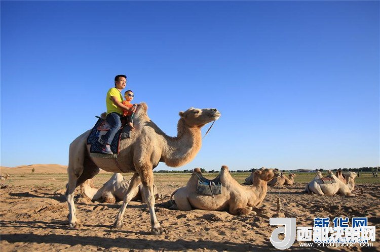 7月25日,一對父子在庫布其沙漠七星湖景區(qū)體驗(yàn)騎駱駝。 新華社記者 盧燁 攝