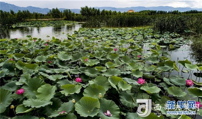 8月22日無人機拍攝的廣靈縣壺流河濕地盛開的荷花。新華社記者 陶明 攝