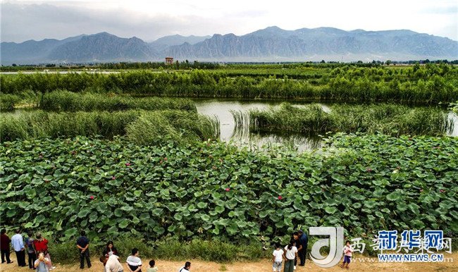 8月22日,游人在廣靈縣壺流河濕地觀賞盛開的荷花(無人機拍攝)。新華社記者 陶明 攝