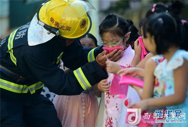 8月27日,滄州市公安消防支隊(duì)新華區(qū)建設(shè)大街中隊(duì)的消防戰(zhàn)士指導(dǎo)幼兒園的孩子從“著火”的校車中緊急疏散。