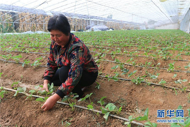 山東沂水縣龍家圈街道寨里社區(qū)居民在草莓大棚內(nèi)勞作(10月9日攝)。這里是由扶貧資金投資建設(shè)的草莓種植基地,也是山東臨沂“四權(quán)分置”扶貧新模式的“試驗田”。新華社記者 王南 攝