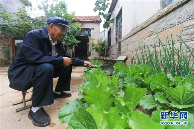 山東沂水縣龍家圈街道寨里社區(qū)居民王培義老人在給家中的院子里蔬菜澆水(10月9日攝)。得益“四權(quán)分置”的制度設(shè)計,今年89歲的貧困戶王培義已連續(xù)3年收到草莓大棚效益分紅。新華社記者 王南 攝