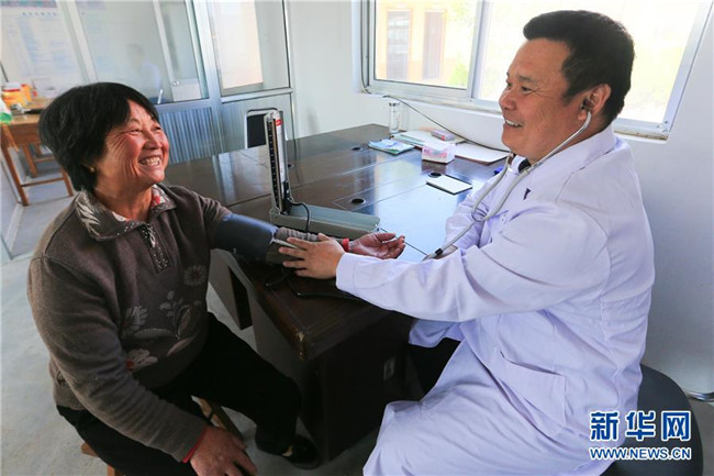 在山東蒙陰縣云夢湖生態(tài)區(qū)東汶社區(qū)的農(nóng)村幸福院養(yǎng)老院的醫(yī)務(wù)室,醫(yī)生為老人測量血壓(10月11日攝)。2016年,東汶社區(qū)將原來的村兩委大院擴建為農(nóng)村幸福院養(yǎng)老院,委派專人負責(zé)老人們的一日三餐。同時按照“子女交納、集體補助、社會捐贈、財政獎勵”的模式設(shè)立孝心養(yǎng)老基金,每月定時發(fā)給貧困老人。新華社記者 王南 攝