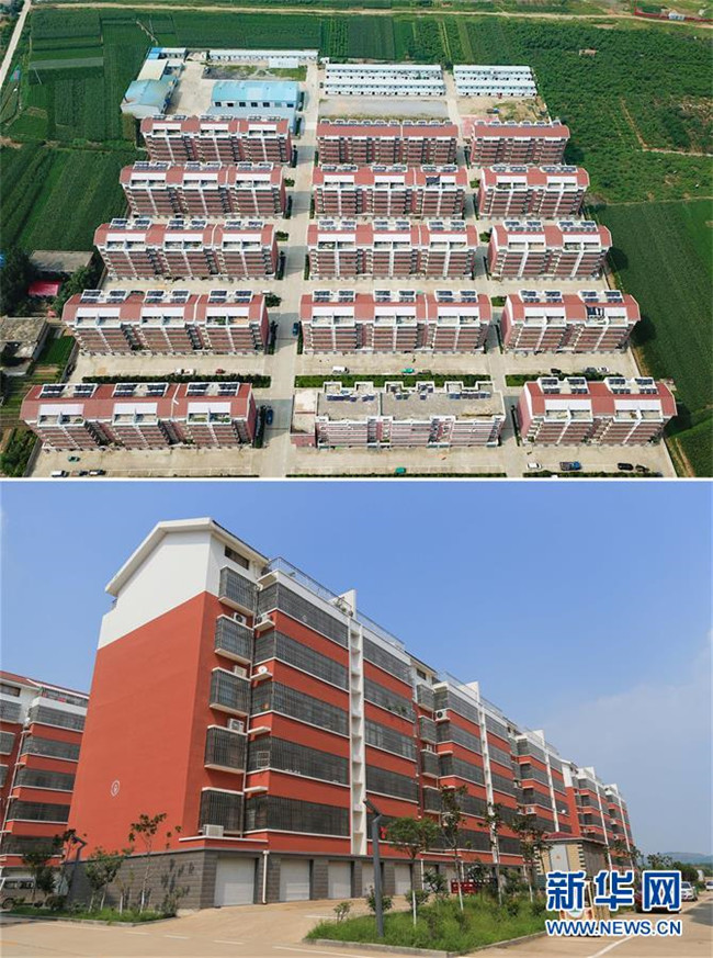 拼版照片(8月22日攝):上圖為無人機拍攝的山東費縣朱田鎮(zhèn)崔家溝社區(qū);下圖為山東省臨沂市費縣朱田鎮(zhèn)崔家溝社區(qū)的居民樓。崔家溝村是遠近聞名的“光棍村”“貧困村中的貧困村”。2016年3月,崔家溝村在中央異地搬遷政策的扶持下,實現(xiàn)了整體搬遷,1600多口人搬到了鎮(zhèn)駐地。從此,昔日的“光棍村”,一躍進入朱田鎮(zhèn)富裕村行列。新華社記者 王南 攝