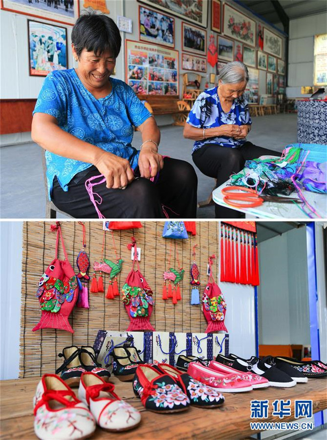 拼版照片(8月22日攝):上圖在山東費縣朱田鎮(zhèn)崔家溝社區(qū)的居家靈活就業(yè)培訓(xùn)中心,當?shù)卮迕裨诳p制手工飾品;下圖當?shù)卮迕窨p制的手工飾品和布鞋(8月22日攝)。崔家溝村是遠近聞名的“光棍村”“貧困村中的貧困村”。2016年3月,崔家溝村在中央異地搬遷政策的扶持下,實現(xiàn)了整體搬遷,1600多口人搬到了鎮(zhèn)駐地。從此,昔日的“光棍村”,一躍進入朱田鎮(zhèn)富裕村行列。新華社記者 王南 攝