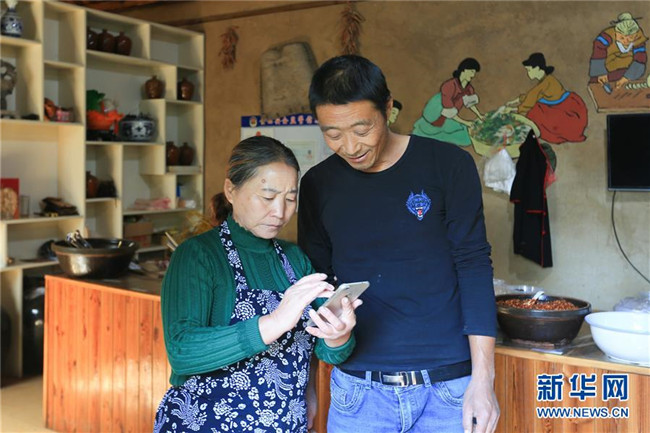 夏永春與妻子用手機查看訂單(10月10日攝)。貧困戶夏永春兩口子靠著地道鄉(xiāng)土手藝,在山東蘭陵縣金嶺鎮(zhèn)壓油溝風(fēng)景區(qū)里開了一家農(nóng)家特色咸菜坊,年收入一下躥升到七八萬元。新華社記者 王南 攝