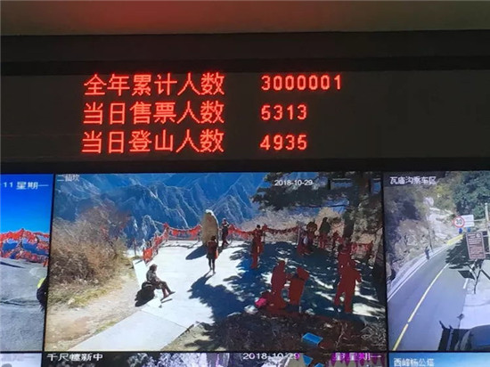 截止2018年10月29 日上午11時43分,華山景區(qū)購票人數(shù)突破300萬人次,與去年同期相比增長60萬人次,增長率25%,創(chuàng)歷史新高。取得這樣喜人的成績,是華旅集團(tuán)引領(lǐng)企業(yè)發(fā)展新航向、上下求索的碩果,是票務(wù)服務(wù)中心及兄弟單位密切配合,扎實工作,共同努力的結(jié)果,是干部職工上下一心,不辭辛勞,真抓實干的效果,是海內(nèi)外游客對華山景區(qū)優(yōu)美景色,優(yōu)質(zhì)服務(wù)認(rèn)可的成果。