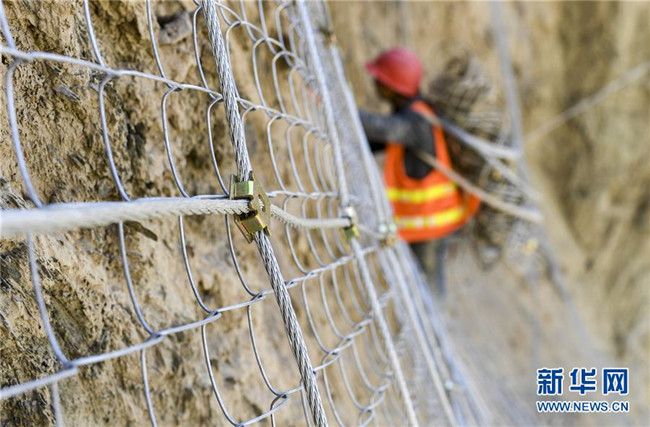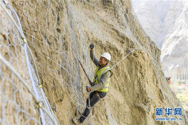 11月12日,在新疆塔什庫爾干塔吉克自治縣大同鄉(xiāng)鄉(xiāng)政府附近的一處路段,來自四川的吳飛在峭壁上安裝防護網。 近日,一支由四川、云南等地工人組成的施工隊忙碌在帕米爾高原深處的大山中,為塔什庫爾干塔吉克自治縣縣城至大同鄉(xiāng)道路的易落石路段安裝防護網。崇山峻嶺間,工人要攀爬至峭壁上施工作業(yè),如躍動在大山間的“舞者”。據介紹,這支施工隊常年活躍在新疆山區(qū)道路的施工現場,為風險路段加裝安全防護裝置,保障過往車輛和沿途村民出行安全。 新華社記者 胡虎虎 攝