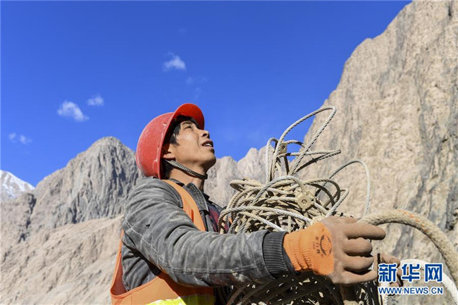 11月12日,在新疆塔什庫爾干塔吉克自治縣大同鄉(xiāng)鄉(xiāng)政府附近的一處路段,來自云南的王華國在運送防護網。 近日,一支由四川、云南等地工人組成的施工隊忙碌在帕米爾高原深處的大山中,為塔什庫爾干塔吉克自治縣縣城至大同鄉(xiāng)道路的易落石路段安裝防護網。崇山峻嶺間,工人要攀爬至峭壁上施工作業(yè),如躍動在大山間的“舞者”。據介紹,這支施工隊常年活躍在新疆山區(qū)道路的施工現場,為風險路段加裝安全防護裝置,保障過往車輛和沿途村民出行安全。 新華社記者 胡虎虎 攝