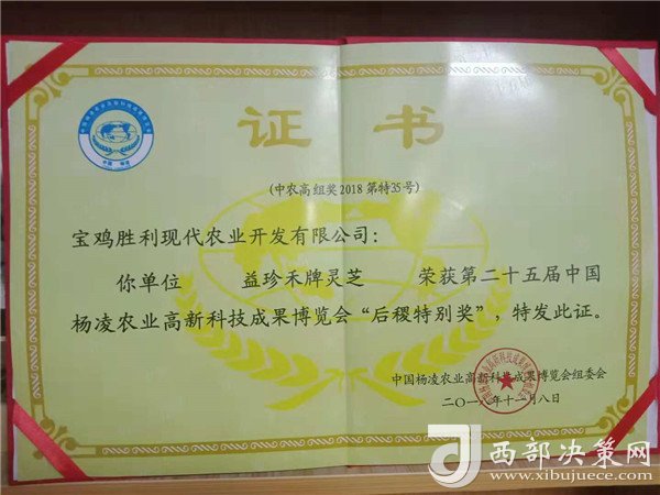 2018年寶雞勝利農業(yè)開發(fā)有限公司生產的特色優(yōu)質拳頭產品“益珍禾”牌靈芝參展第二十五屆農高會,以卓越的品質喜獲“后稷特別獎”。(供稿人:豆清海)