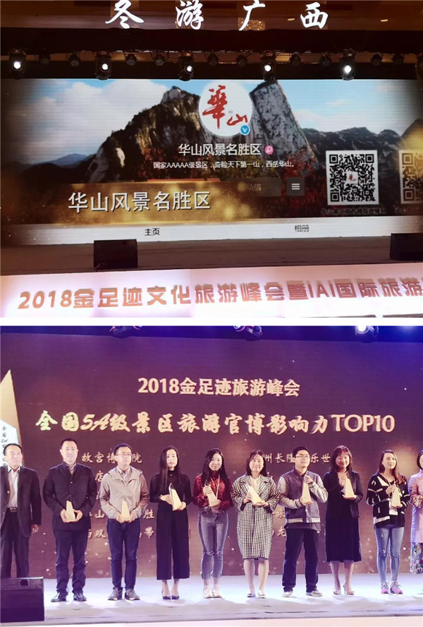 金足跡文化旅游峰會是由新浪網(wǎng)、微博打造的全國性旅游峰會,是旅游行業(yè)的年度大會。本次峰會上發(fā)布了《2018全國旅游數(shù)據(jù)報(bào)告》,公布全國省級旅游官博影響力TOP10、全國市級旅游官博影響TOP10、全國5A級景區(qū)官博影響力TOP10及新媒體創(chuàng)新獎名單,華山風(fēng)景名勝區(qū)榮獲全國5A級景區(qū)官博影響力TOP10。