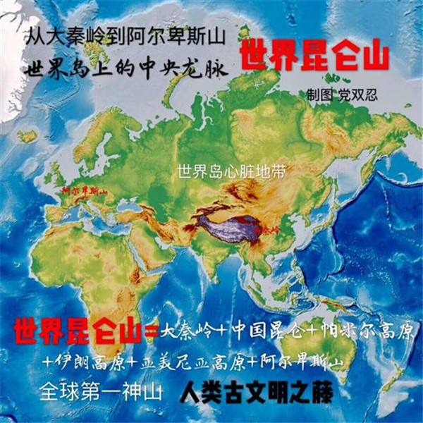 按照中國傳統(tǒng)的龍脈理論,“亞歐大陸的脊梁”也是“世界島”中央龍脈所在。由于人類古文明,包括古華夏、古印度、古波斯、古巴比倫,古希臘,皆源自“亞歐大陸脊梁”,所以也可稱其為“世界昆侖山”。著名的“絲稠之路”,也是從中國大秦嶺到歐洲阿爾卑斯山之路,也可稱之為“世界昆侖山之路”。過去,德國人首先“發(fā)現(xiàn)”了古老的“絲綢之路”。進入21世紀,英國人又率先以“絲綢之路”的視角,重新著述了“一部全新的人類史”。今天,中國人以“亞歐大陸的脊梁”為視野,將“世界島”連為一體,著述“一帶一路”,著述“大秦嶺到阿爾卑斯山之路”,著述“世界昆侖山之路”,也算是一個世界“地理新發(fā)現(xiàn)”。