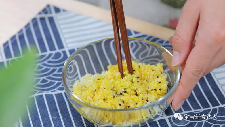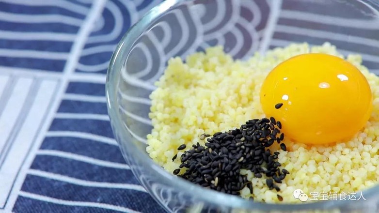 5.準(zhǔn)備好的小米飯內(nèi),加入一個(gè)蛋黃、和少量黑芝麻。