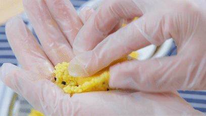 8.小米餅內(nèi)放入一個(gè)紅薯?xiàng)l,將其包裹起來,收口。