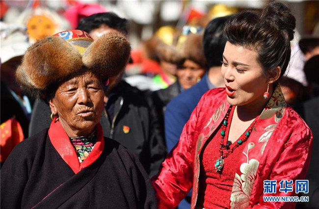 克松社區(qū)村民央金(左)和歌手合唱《我和我的祖國》(3月20日攝)。  新華社記者 覺果 攝