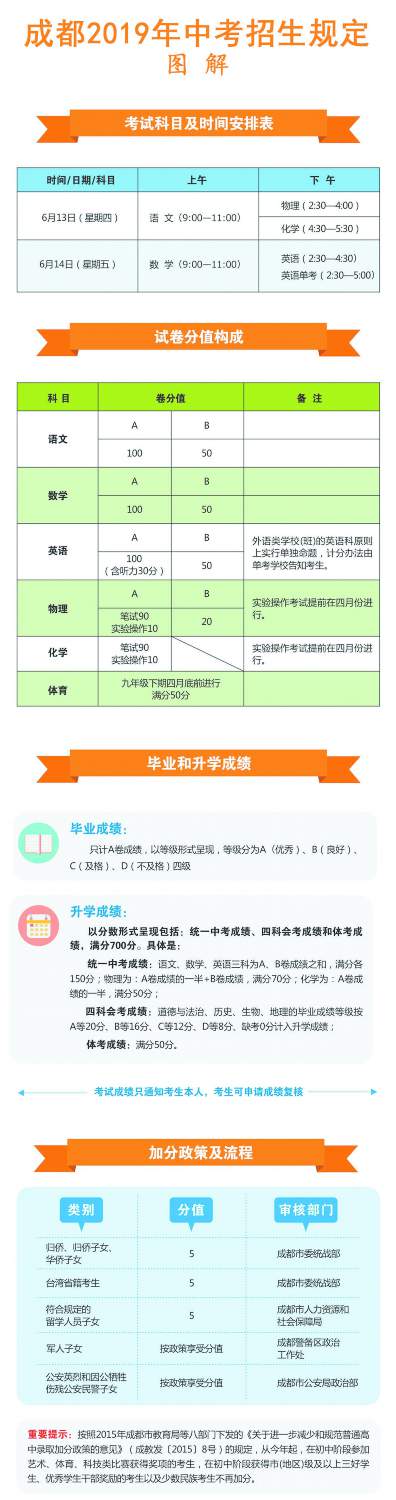 今年中考考試時間與往年一樣,為6月13日、14日,考試科目和計分辦法均未作調(diào)整。也即是說,今年中考統(tǒng)一考試科目依然為語文、數(shù)學(xué)、英語、物理、化學(xué)、體育六科。其中,物理、化學(xué)包括實驗操作考試。體育考試以及物理、化學(xué)實驗操作考試在九年級下期4月底以前,由各區(qū)(市)縣組織進行。九年級結(jié)束時,語、數(shù)、英、物、化五科的畢業(yè)考試與升學(xué)考試一并進行,各科筆試考試均為閉卷考試,具體時間安排詳見圖解。其中,外語類學(xué)校(班),如成外實外等校的英語科,原則上單獨命題,統(tǒng)一考試。