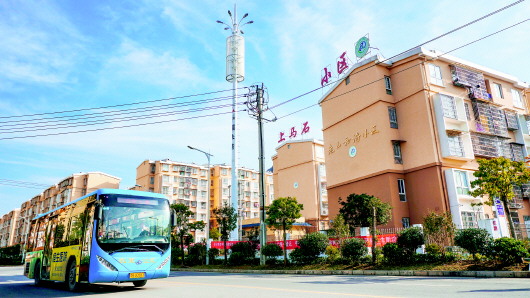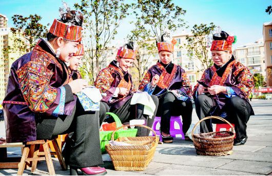 圖1:公交車開進凱里市上馬石易地扶貧搬遷安置小區(qū)。圖2:凱里市上馬石易地扶貧搬遷安置點廣場上的繡娘。(凱里市宣傳部供圖)
