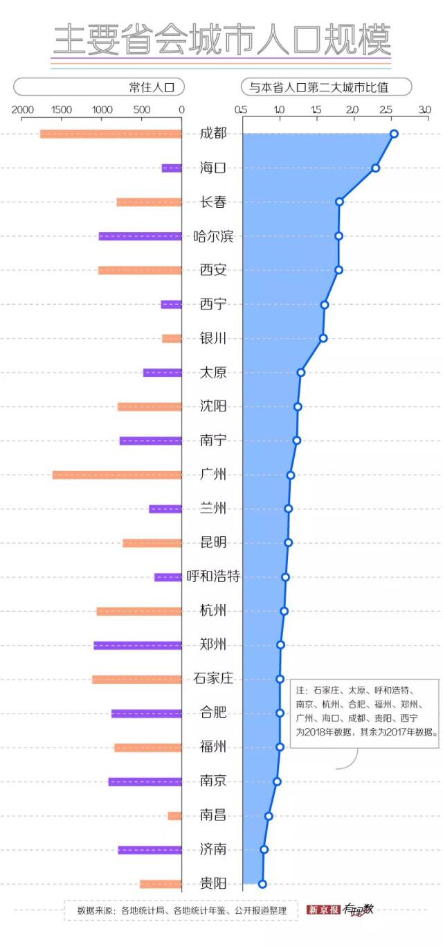 我們可以分三個區(qū)間來看下方數(shù)據(jù)圖中標(biāo)示的“與本省人口第二大城市比值”:比值大于 1 說明該省會的人口規(guī)模全省第一,比值等于 1 說明該省會是全省人口第二大城市,比值小于 1 說明該省會的人口規(guī)模要排在全省第三甚至更后。