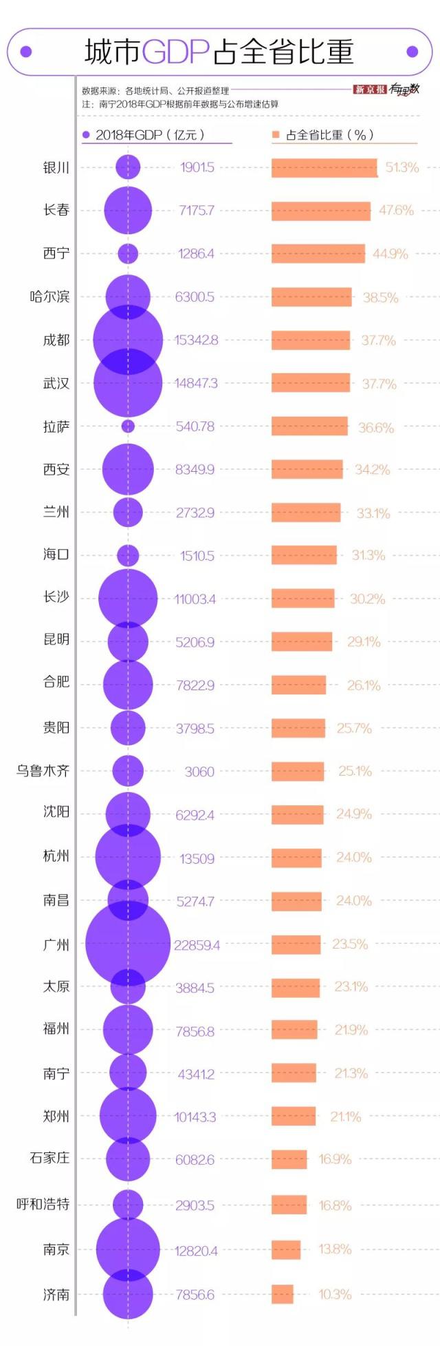 我們梳理了 27 個省和自治區(qū) 2018 年的地區(qū)生產(chǎn)總值后發(fā)現(xiàn),目前西藏、青海、寧夏、海南、甘肅五地 GDP 未破萬億,所以相應(yīng)的拉薩、西寧、銀川、???、蘭州留給大家的記憶點可能不多;而像江蘇、山東兩地 GDP 可以排在全國前十,但其省會城市南京、濟南的 GDP 占全省比重不到 15%。