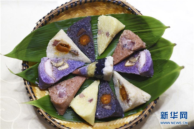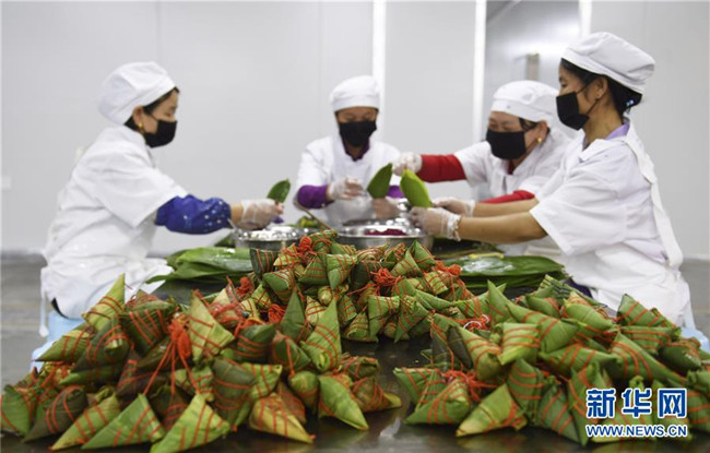 端午節(jié)將至,貴州省黔東南苗族侗族自治州臺江縣粽子加工企業(yè)加緊制作具有當(dāng)?shù)靥厣奈宀属占案魇紧兆?,滿足市場需求。