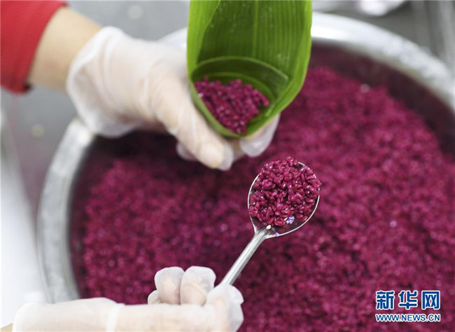 6月2日,在臺江縣一家食品生產(chǎn)企業(yè)車間,工人在包制五彩粽?!⌒氯A社發(fā)(劉開福 攝)