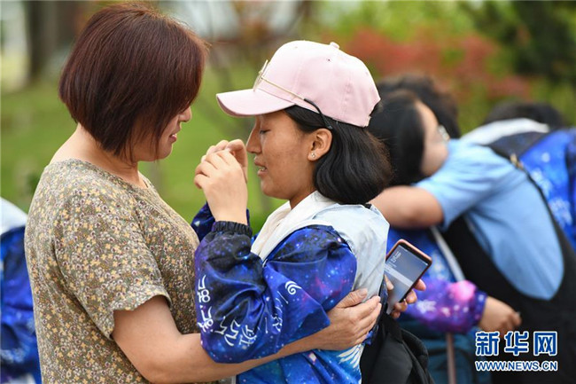 6月9日,合肥市第三十五中學西藏班的初三畢業(yè)生(右)與老師告別時落淚。
