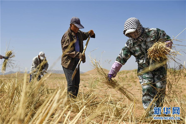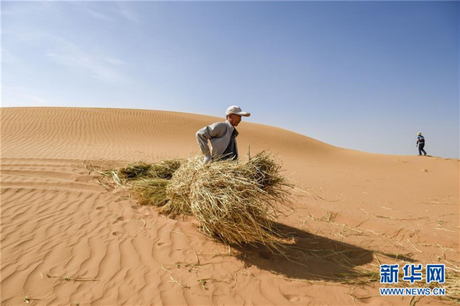 在寧夏中衛(wèi)市長(zhǎng)流水沙區(qū),治沙工人在沙漠中搬運(yùn)麥草(6月13日攝)。新華社記者馮開華攝