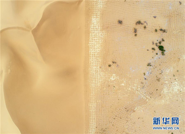 寧夏中衛(wèi)市長(zhǎng)流水沙區(qū),一邊是沙漠,一邊是用草方格治理后的區(qū)域(6月12日無人機(jī)拍攝)。